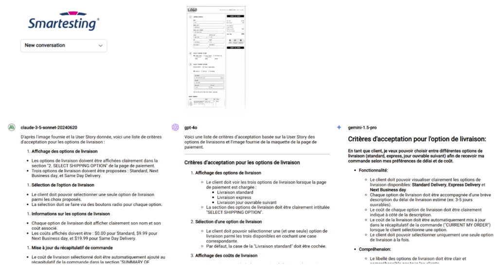 On peut constater dans le critère d’acceptation numéro 11 une référence à un bouton de validation qui n’est pas présent sur l’image. C’est la puissance de l’apprentissage du LLM sur une grande quantité de données (dont des sites de eCommerce) qui vient compléter l’analyse de l’image fournir : les capacités de vision et de génération du LLM se combinent.