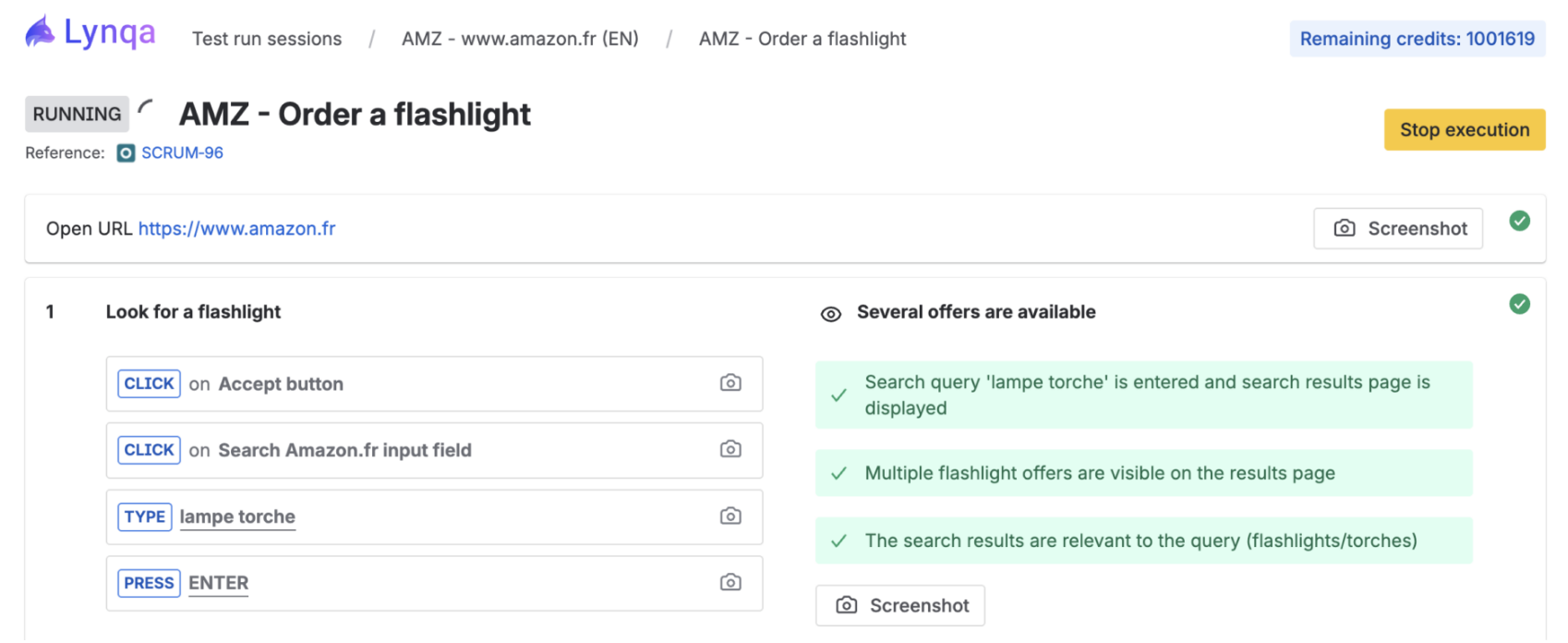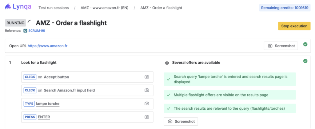 Lynqa reads your natural-language steps and performs the actions in your application (navigation, clicks, inputs…), while capturing evidence along the way.