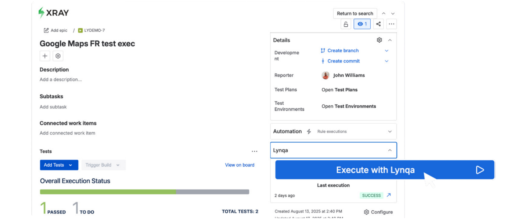 Lynqa for Xray (Jira Cloud) executes your tests directly from Xray and sends step-by-step reports and evidence back to Xray in one click. No scripts to create or maintain. No test rewriting.
