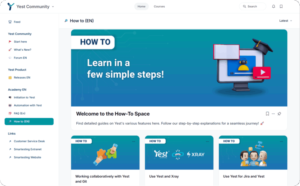 The Yest® Academy How-To guides let you explore Yest®’s core features through detailed, use-oriented explanations. You’ll learn how to integrate Yest® with your everyday tools such as Jira, Xray, and many more.