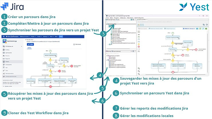 Par exemple, nous décrivons ci-dessous les interactions possibles en Yest et Jira à travers l’add-on Yest for Jira :
