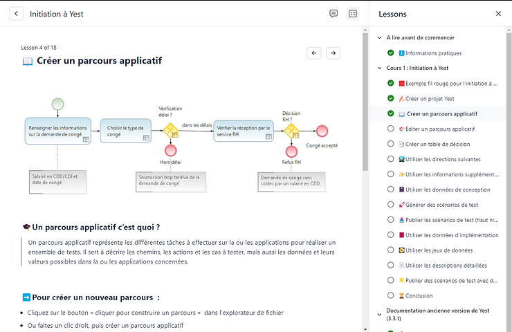 Chaque leçon décrit une fonctionnalité de Yest, comme dans l’image ci-dessus qui présente comment créer un parcours applicatif. Une définition présente la fonctionnalité, puis comment l’utiliser. Le tout suivi d’une mise en pratique.