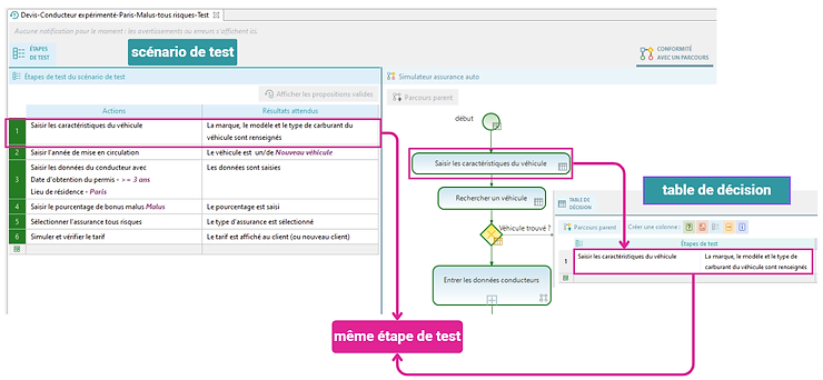 Ci-dessous nous présentons la relation entre les parcours, les tables de décision et les scénarios dans Yest. On peut y voir que le parcours contient des tables de décision qui constituent les scénarios de test.