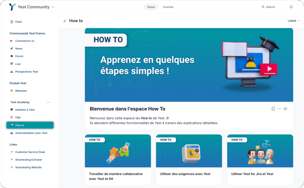 Les « How To » de la Yest® Academy vous permettent d’explorer les fonctionnalités clés de Yest® à travers des explications détaillées et orientées usage. Vous y apprendrez notamment comment utiliser Yest® en lien avec vos outils du quotidien, comme Jira, Xray et bien d’autres.